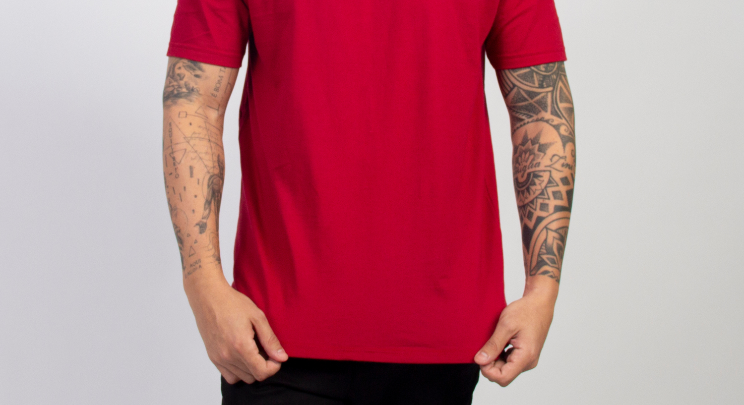 Referência de tamanho: o modelo da foto tem 1,77m de altura, 75kg e veste tamanho M, demonstrando o caimento real da peça.
